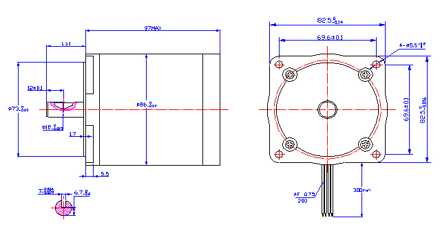 混合式步進電機 詳細說明: 步距角誤差…………………5% 最高溫升……………………80℃ Max 環境溫度范圍………………-20℃~+50℃ 絕緣電阻……………………100MΩMin.500 VDC 介電強度……………………500V AC 1 minute